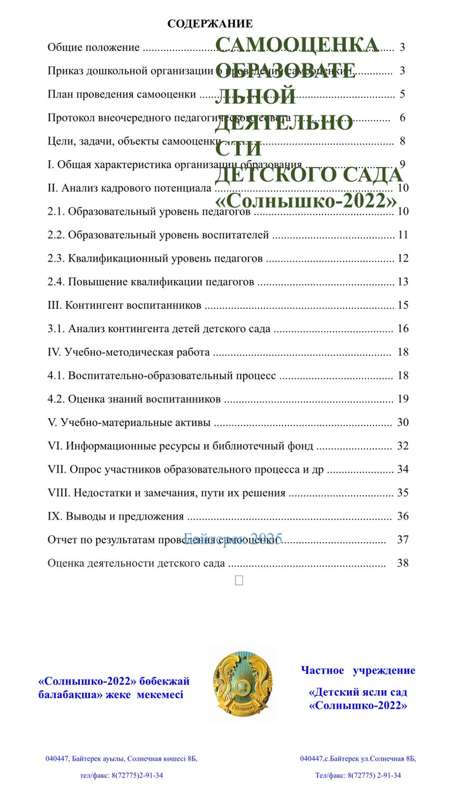 Задачи Программы: создание предметно-пространственной развивающей среды, обеспечивающей охрану жизни и укрепление здоровья ребенка и их социализация, обеспечение принципов преемственности и непрерывности в дошкольном образовании, интеграция образовательных областей, применение инновационных методик и технологий для интеллектуального, социального и личностного развития ребенка, обеспечение единства обучающих, развивающих и воспитывающих задач, совместное сотрудничество дошкольной организации, школы и семьи, удовлетворение потребности родительской общественности в воспитании детей дошкольного возраста.